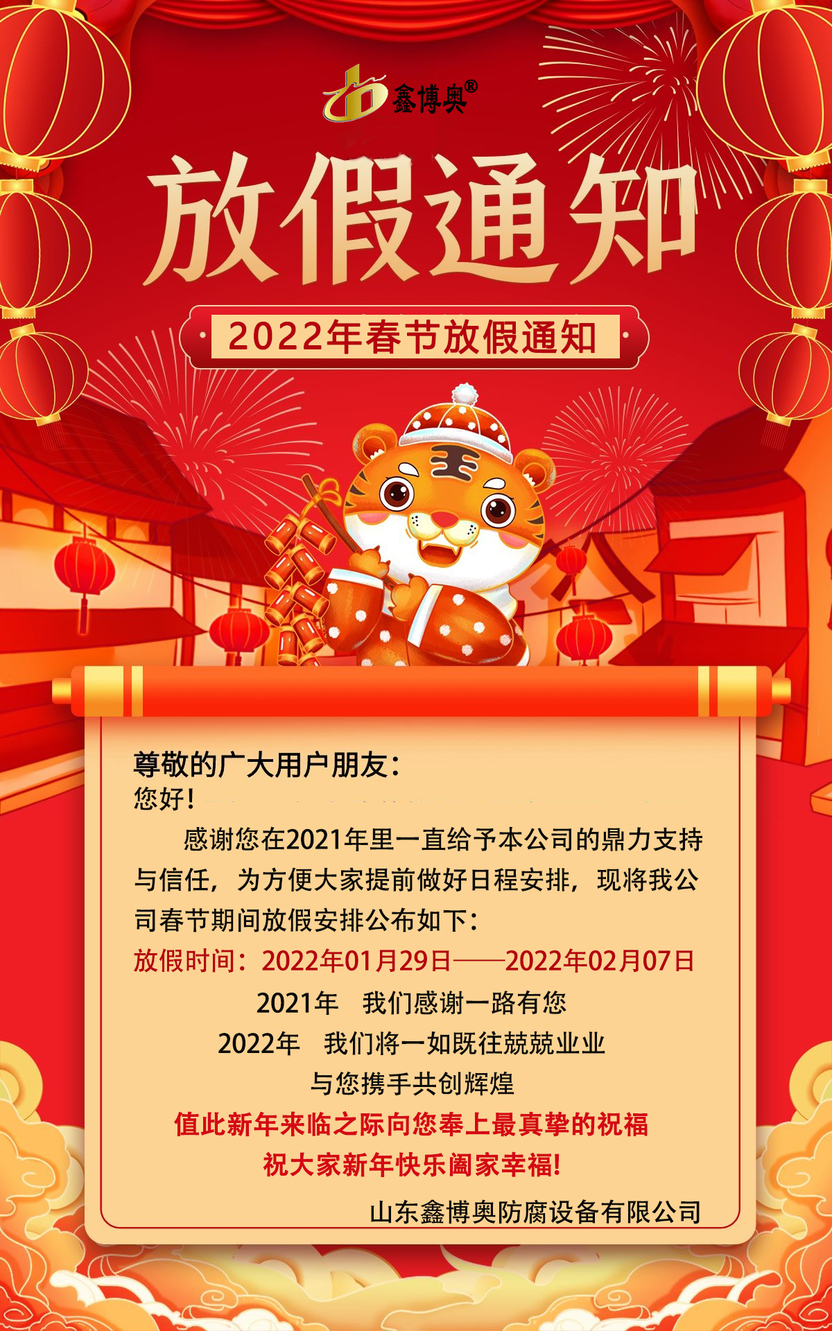 山東鑫博奧防腐設(shè)備有限公司自成立以來(lái),一直得到您的大力支持和幫助,值此春節(jié)來(lái)臨之際,為了感謝您多年來(lái)對(duì)山東鑫博奧的支持與厚愛(ài),鑫博奧全體員工謹(jǐn)向您表示衷心的感謝和美好的祝福!